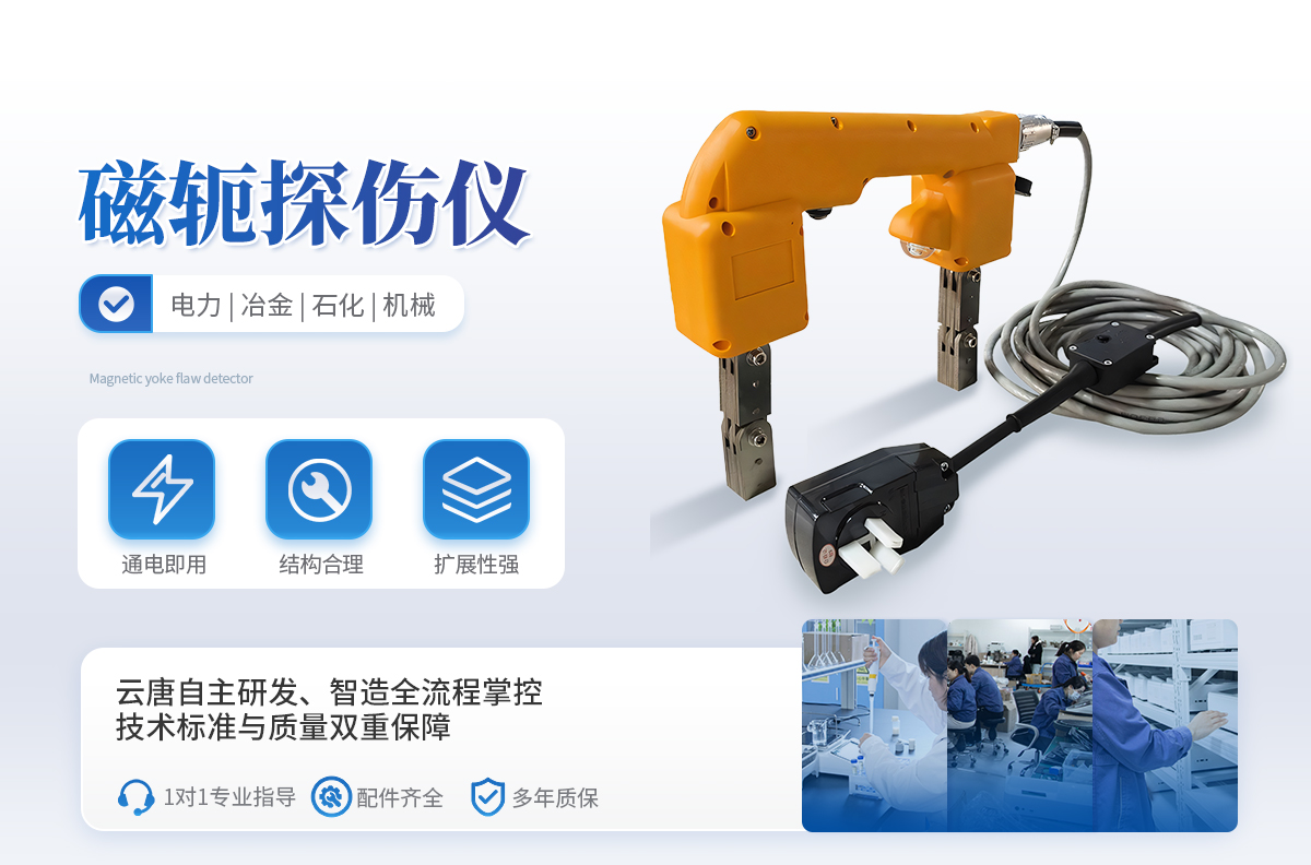 該儀器磁化電源具有電池電量顯示功能,方便用戶觀察電池電量并及時(shí)充電。電磁軛采用高導(dǎo)磁芯、一體化線圈,重量輕,使用壽命長(zhǎng)。采用高能鋰電池供電,電池電量大,使用時(shí)間長(zhǎng),特別適合高空作業(yè)、鍋爐、壓力容器內(nèi)部結(jié)構(gòu)的磁粉探傷,解決了現(xiàn)場(chǎng)無(wú)電源的麻煩,提高了工作時(shí)的安全系數(shù),降低工作人員的勞動(dòng)強(qiáng)度。儀器符合JB/T7411-2012《電磁軛磁粉探傷儀技術(shù)條件》標(biāo)準(zhǔn)要求。