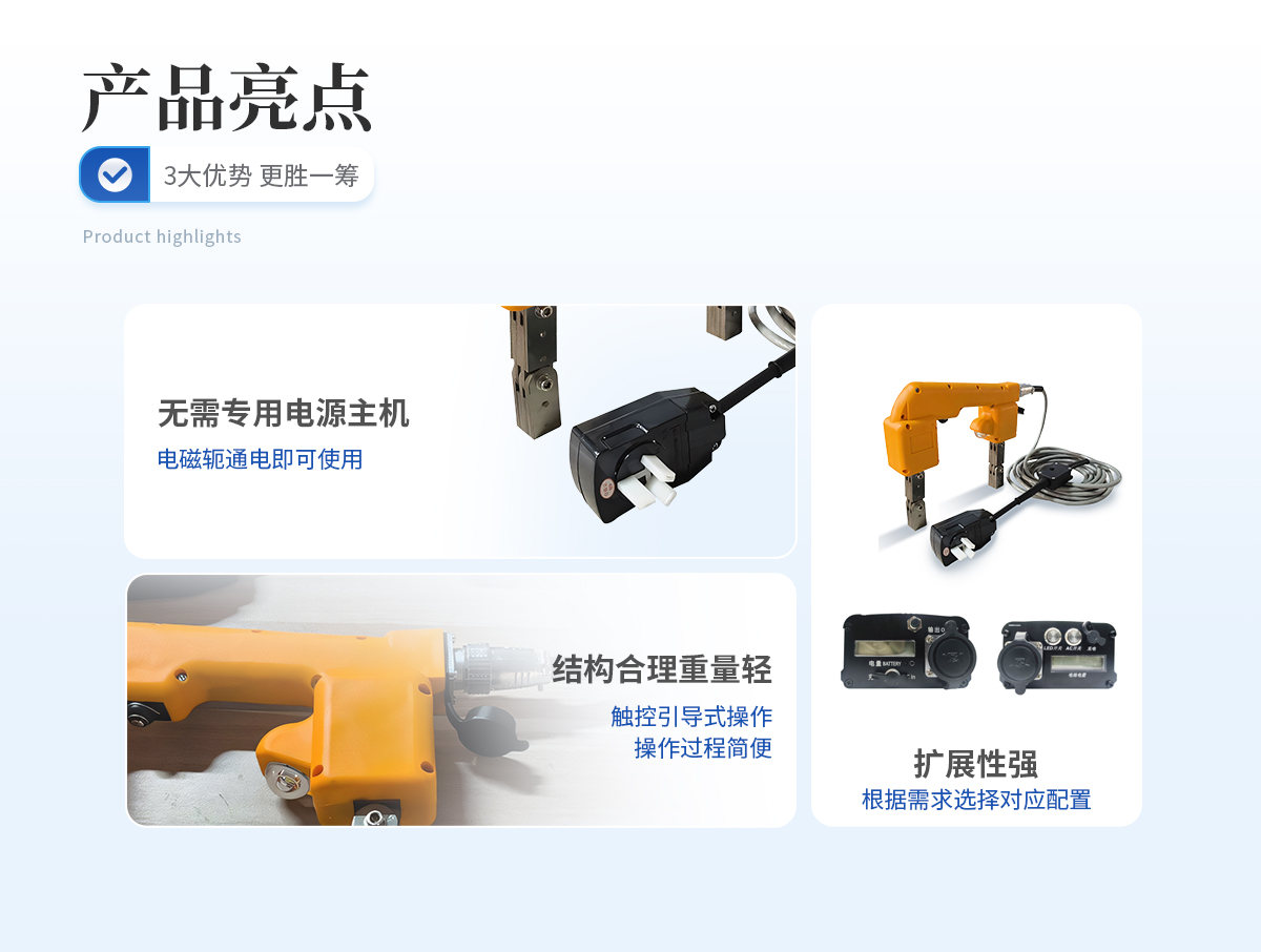 | 1、 無(wú)需專(zhuān)用電源主機(jī),電磁軛通電即可使用; | 2、 體積小巧,重量輕; | 3、 開(kāi)模制作,結(jié)構(gòu)合理,手感舒適; | 4、 磁軛標(biāo)配白光燈,可選熒光燈(不額外加費(fèi)用); | 5、 配專(zhuān)用儀器箱; | 6、 擴(kuò)展性強(qiáng),可根據(jù)需要增配對(duì)應(yīng)的專(zhuān)用電池包,通過(guò)專(zhuān)用電源來(lái)實(shí)現(xiàn)交流、直流磁化功能。可滿足不方便拖電源線的場(chǎng)所使用。 |