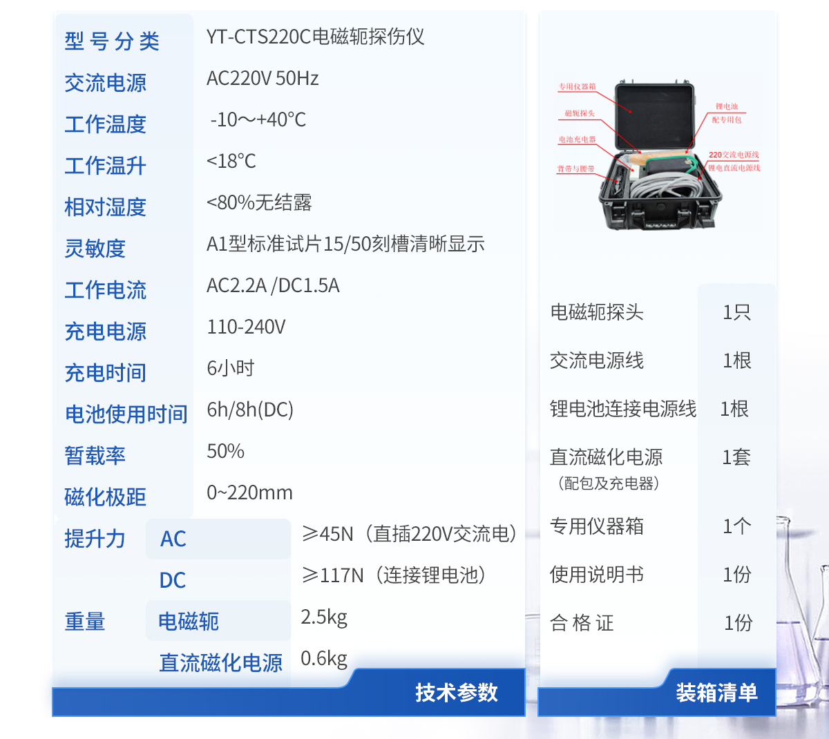 | 1.磁軛探頭1只 | 2.交流電源線1根 | 3.鋰電池連接電源線 1 根 | 4.直流磁化電源(配包及充電器) 1 套 | 5.專(zhuān)用儀器箱 1 個(gè) | 6.使用說(shuō)明書(shū) 1 份 | 7.合 格 證 1 份 |