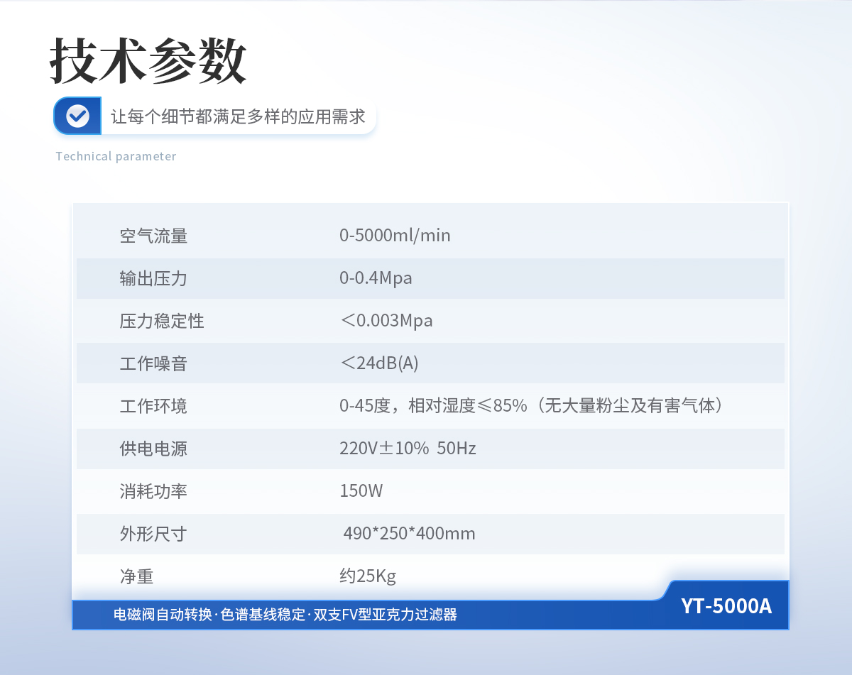 1、空氣流量: 0-5000ml/min    2、輸出壓力: 0-0.4Mpa    3、壓力穩定性:<0.003Mpa    4、工作噪音: <24dB(A)    5、工作環境: 0-45度,相對濕度≤85%(無大量粉塵及有害氣體)    6、供電電源: 220V±10% 50Hz    7、消耗功率: 150W    8、外形尺寸: 490*250*400mm    9、凈重: 約25Kg