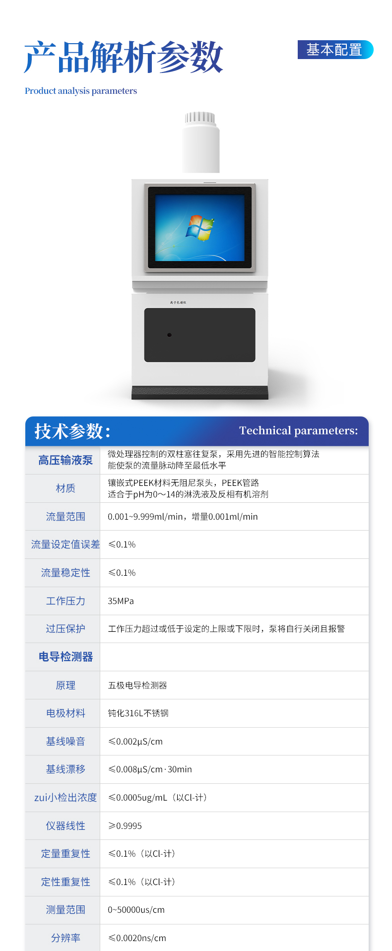 微處理器控制的雙柱塞往復(fù)泵,采用**的智能控制算法,能使泵的流量脈動降至**水平。 1.1,材質(zhì):鑲嵌式PEEK材料無阻尼泵頭,PEEK管路,適合于pH為0~14的淋洗液及反相有機溶劑。 1.2,流量范圍:0.001~9.999ml/min,增量0.001ml/min。 1.3,流量設(shè)定值誤差:≤0.1% 1.4,流量穩(wěn)定性:≤0.1% 1.5,工作壓力:35MPa 1.6,過壓保護(hù):工作壓力超過或低于設(shè)定的上限或下限時,泵將自行關(guān)閉且報警。 | 2 電導(dǎo)檢測器: 2.1,原理:五極電導(dǎo)檢測器 2.2,電極材料:鈍化316L不銹鋼 2.3,基線噪音:≤0.002μS/cm 2.4,基線漂移:≤0.008μS/cm·30min 2.5,zui小檢出濃度:≤0.0005ug/mL(以Cl-計) 2.6,儀器線性:≥0.9995 2.7,定量重復(fù)性:≤0.1%(以Cl-計) 2.8,定性重復(fù)性:≤0.1%(以Cl-計) 2.9,測量范圍:0~50000us/cm 2.10,分辨率:≤0.0020ns/cm 2.11,檢測池體積:0.8uL 2.12,操作壓力:≤10Mpa。 2.13,電導(dǎo)檢測量程: 0-50000uS,10檔可調(diào)。 | 3、 陰、陽離子抑制器: 3.1連續(xù)自動再生電化學(xué)微膜抑制器,在線自動再生,高抑制容量,低背景電導(dǎo),低噪聲,基線穩(wěn)定,免維護(hù)。 3.2抗污染,耐壓好,壽命長,使用范圍廣(PH0-14)。 3.3體積小,穩(wěn)定時間快,穩(wěn)定時間不大于12分鐘,且重現(xiàn)性好。 | 4 流路系統(tǒng): 4.1流路系統(tǒng)使用PEEK材料制造,通用性好,能使用強酸、強堿的淋洗液。 4.2百分之百的有機溶劑兼容,方便用戶對復(fù)雜樣品進(jìn)行分析、沖洗和維護(hù)。 4.3 結(jié)構(gòu)緊湊,流路*短,對流路造成的峰型擴(kuò)展有很好的改善。 4.4 內(nèi)置多處漏液報警器和缺水報警器,全方位安全監(jiān)控。 | 5 內(nèi)置色譜工作站: 5.1 24位高精度高靈敏度數(shù)模轉(zhuǎn)換。 5.2專用離子色譜工作站,全中文顯示,通過USB方式與電腦進(jìn)行數(shù)字信號傳輸,完成色譜數(shù)據(jù)采集及處理。 5.3自動接收分析和控制保存儀器色譜條件。 5.4自動識別負(fù)峰、基線扣除功能。自動積分參數(shù)、自動生成報告。 | 6 色譜柱、抑制器、電導(dǎo)池、放大電路一體恒溫系統(tǒng): 將電導(dǎo)池、流路系統(tǒng)、分離柱、抑制器、放大電路恒溫在同一個控溫基體上置于柱箱內(nèi),恒溫精度5~65℃±0.01℃。并且儀器柱箱采用絕熱結(jié)構(gòu),可保持檢測系統(tǒng)、流路及柱子、抑制器、電導(dǎo)池、放大電路的溫度恒定,獲得高質(zhì)量的分離效果和檢測精度,改善了電導(dǎo)檢測器的溫飄和基線噪聲。 | 7內(nèi)置淋洗液發(fā)生器,僅用高純水,無需人工配制任何化學(xué)試劑,在線產(chǎn)生等度或梯度高純淋洗液,減少基線漂移,提高穩(wěn)定性,簡化工作流程。 | 8 在線自動脫氣系統(tǒng): 1,脫氣效率:在25℃入口流動相的含氧量為8PPM時,出口流動相的含氧量為2PPM (流速:1.5ml\min) 2,真空壓力:-0.018MPa 3,流量:5mL/min | 9 分離能力:(分別配置不同的陰、陽離子分離柱,可以分離的離子種類:) 配置國產(chǎn)陰離子分離柱:一次進(jìn)樣分析:氟化物、氯化物、亞硝酸鹽、磷酸鹽、溴化物、硝酸鹽、硫酸鹽 配置進(jìn)口陰離子分離柱:一次進(jìn)樣分析:氟化物、溴酸鹽、氯化物、亞硝酸鹽、磷酸鹽、溴化物、硝酸鹽、硫酸鹽、亞氯酸鹽、高氯酸鹽、二氯乙酸、三氯乙酸等 配置進(jìn)口陽離子分離柱:一次進(jìn)樣分析::Li+、Na+、NH4+、K+、Ca2+、Mg2+、Sr2+、Ba2+等 | 10 重量:30kg左右 尺寸mm:長500,寬400,高600 |