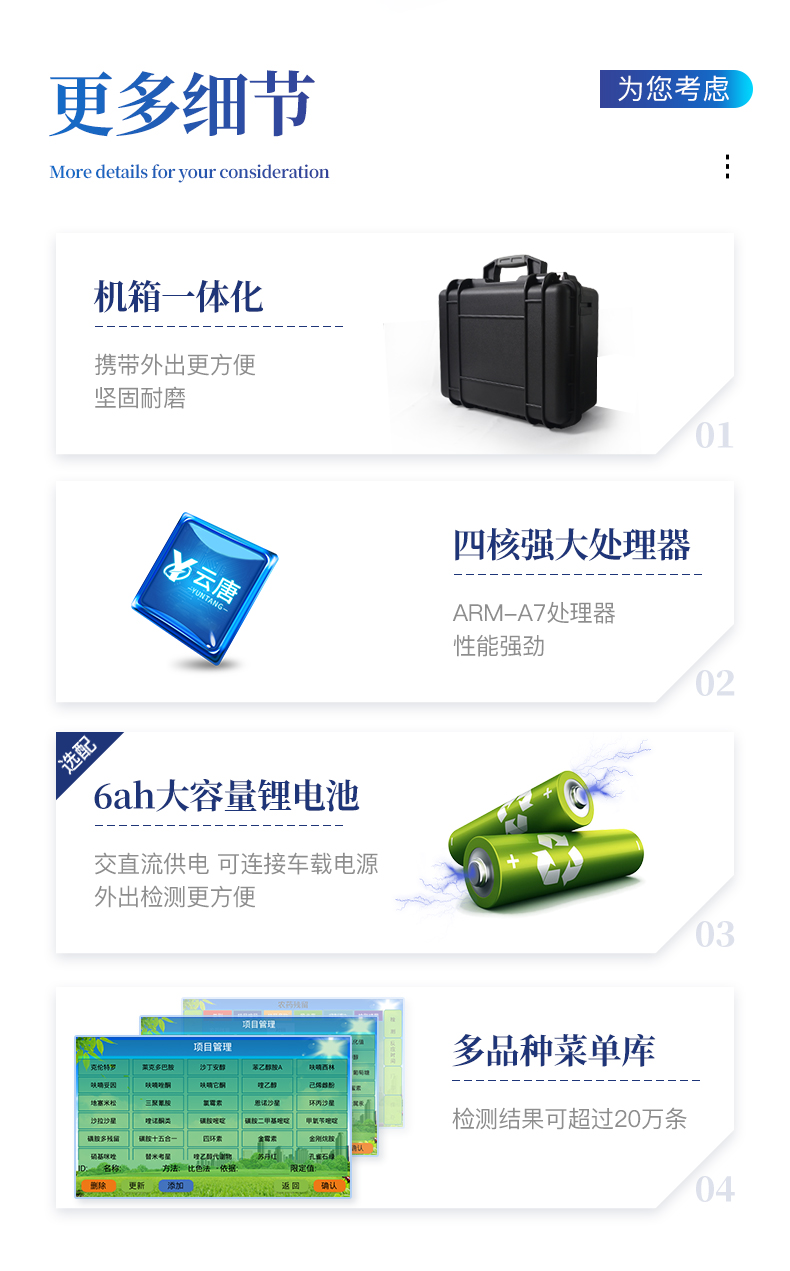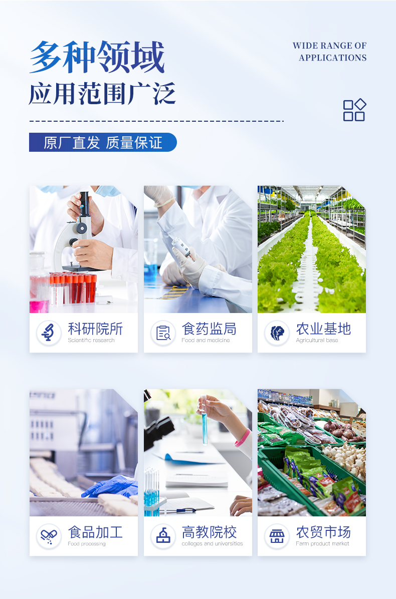 廣泛應用于主要用于蔬菜、水果、茶葉、糧食、農副產品等食品中有機磷和氨基甲酸酯類農藥殘留的快速檢測;此外還可用于果蔬茶生產基地和農貿批發(fā)銷售市場現場檢測,餐館、學校、食堂、家庭果蔬加工前的安全速測等。