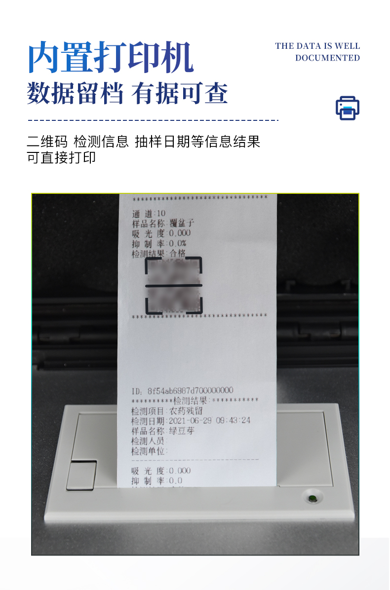 8、打印機采用串口5v打印,可選擇手動打印或者自動打印,三分鐘出打印結果,打印格式為檢測人姓名、吸光度差值、檢測時間、檢測機構、樣品名稱及結果判定。
