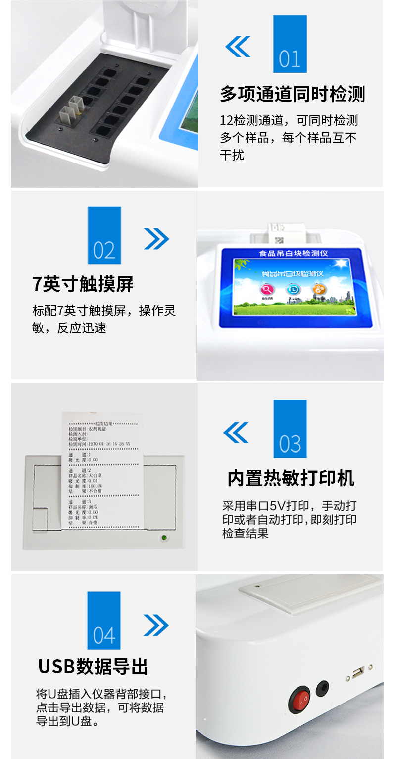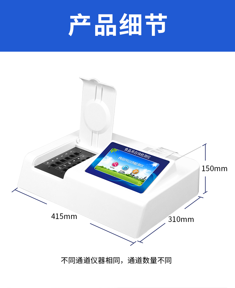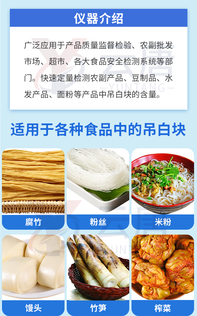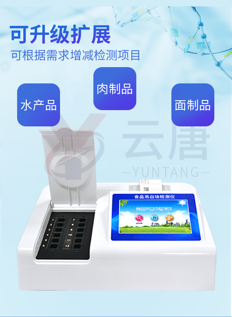 1、 檢測項目:用于快速檢測食品中吊白塊,儀器預留其他項目檢測程序和端口,根據日后需求可方便的自主增加檢測項目。日后可升級為檢測,水產品,肉制品,面制品的綜合類型儀器。