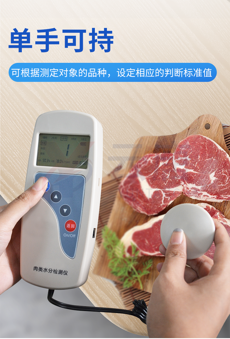 肉類水分檢測儀主要用于快速豬肉、牛肉、雞肉等動物肉類水分含量,從而判斷所測樣品是否為注水肉,該儀器設計精巧,單手可持,儀器可根據測定對象的品種,設定相應的判斷標準值。