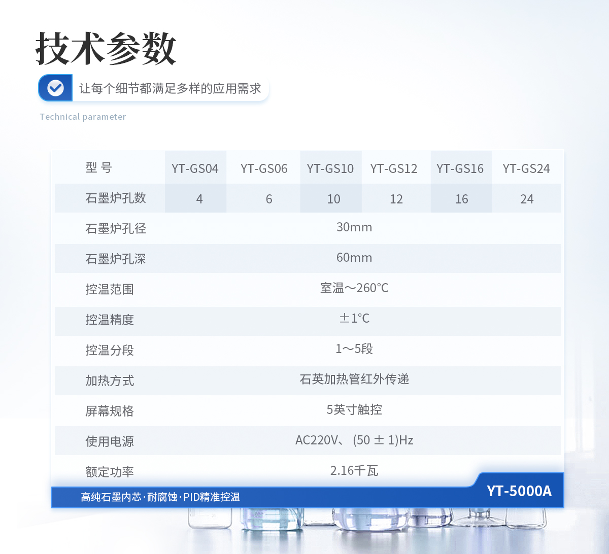 石墨爐孔:孔徑30mm,孔深60mm,孔數(shù)6×4 控溫范圍:室溫~260℃ 控溫精度:±1℃ 控溫分段:1~5段 加熱方式:石英加熱管紅外傳遞 屏幕規(guī)格:5寸觸控 主機(jī)外型尺寸:寬567mm×深460mm×高168mm 使用電源:AC220V、 (50 ± 1)Hz 額定功率:2.16千瓦