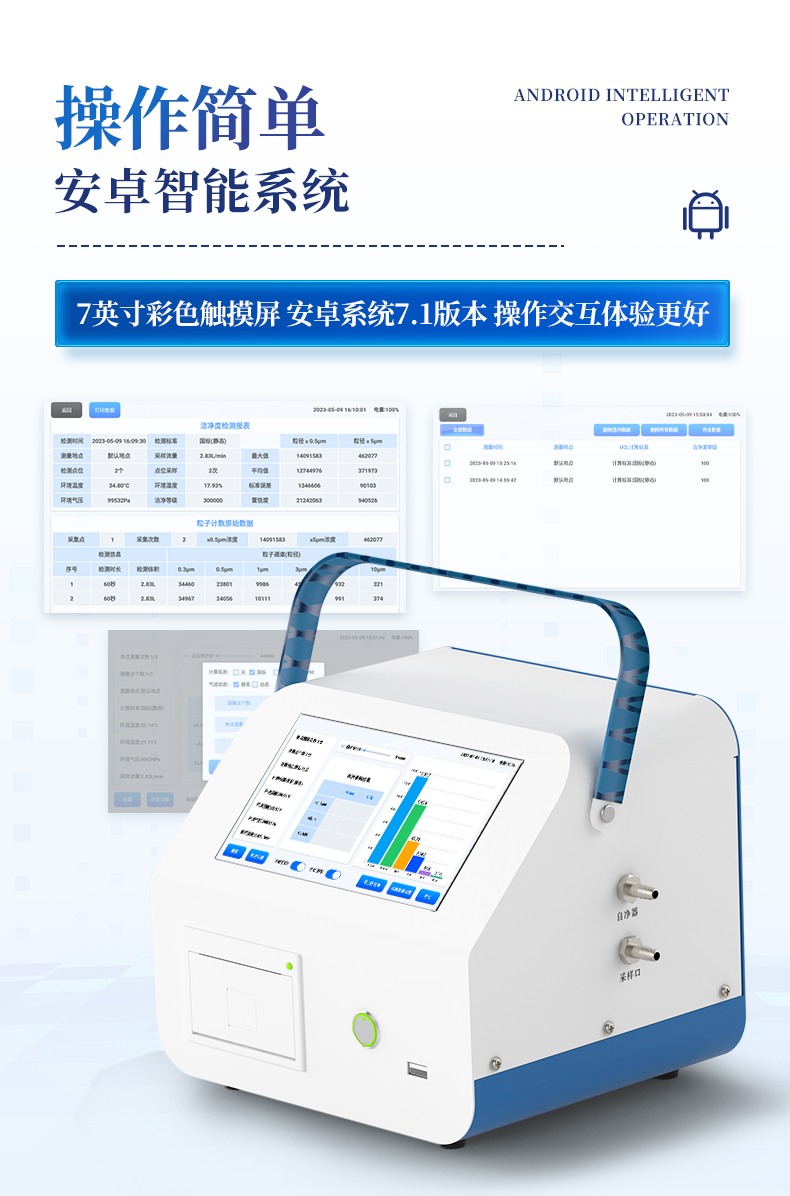 1、安卓系統(tǒng)7.1版本,操作交互體驗更好。 2、內置溫濕度傳感器、環(huán)境氣壓傳感器 3、核心部件光散射傳感器明顯消除腔體的雜散光,信噪比大為提高。從而使測量更準確更可靠。 4、按95%置信度(UCL)計算,計數(shù)結果可換算成m3和ft3 5、依照凈化級別劃分和規(guī)定,自動判定凈化級別,使用便利。 6、支持wifi、藍牙傳輸,數(shù)據(jù)可無線上傳;同時支持U盤拷貝數(shù)據(jù),免驅動插拔。 7、配置監(jiān)管平臺,檢測結果可直接無線傳至平臺,進行潔凈度長短期分析,輔助管理。 8、內置新一代高速熱敏打印機,可選擇所需要打印的粒徑通道,靈活打印結果。 9、交直流兩用,內置充電鋰電池,環(huán)保耐用可支持連續(xù)采樣6小時以上。 10、便捷簡易伸縮式云臺支架,安裝采樣操作更加方便。