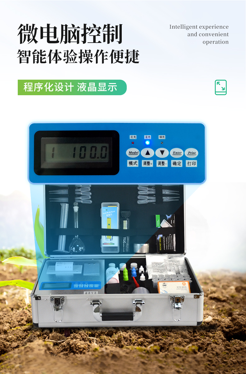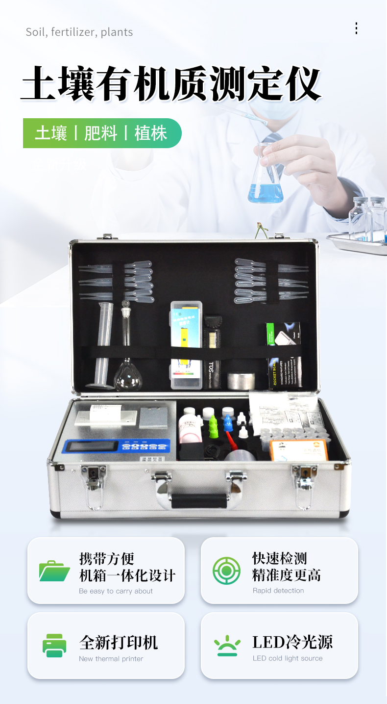 配套齊全:土壤有機(jī)質(zhì)速測(cè)儀該儀器集藥、器、儀為一體,攜帶方便,相當(dāng)于一個(gè)小型實(shí)驗(yàn)室。適于農(nóng)業(yè)服務(wù)部門或農(nóng)資經(jīng)銷商、肥料廠商測(cè)土施肥和鑒別肥料真假。