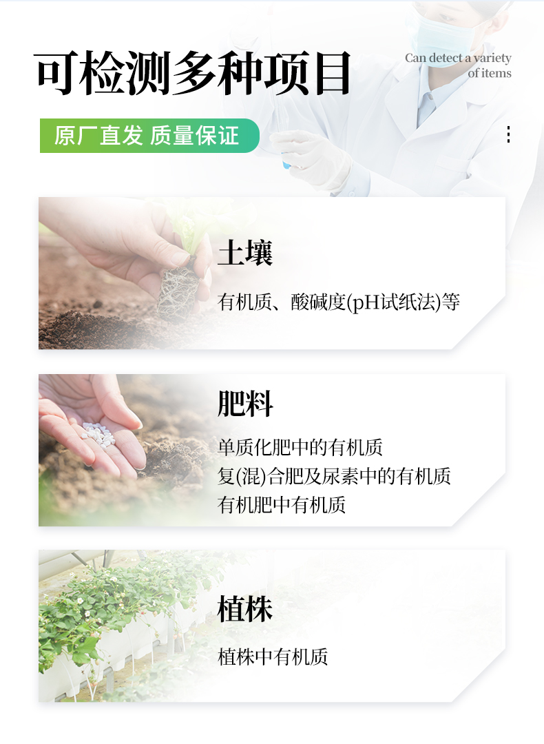 ★可檢測(cè)土壤及化肥、有機(jī)肥、植株中的有機(jī)質(zhì)含量,土壤酸堿度,含鹽量(擴(kuò)展)。