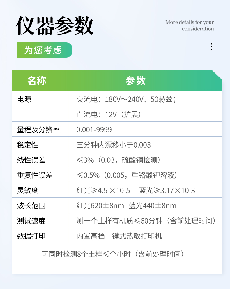 測(cè)一個(gè)土樣有機(jī)質(zhì)≤60分鐘,同時(shí)檢測(cè)三個(gè)土樣有機(jī)質(zhì)≤80分鐘。